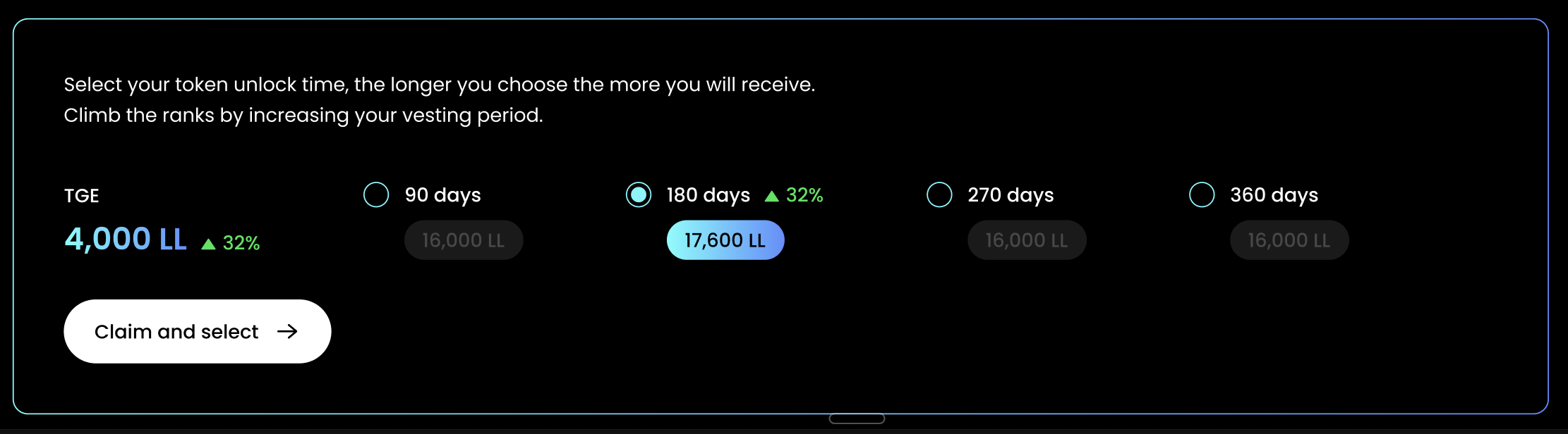 At TGE you will be able to claim your liquid LL tokens and lock in your vesting period selection.