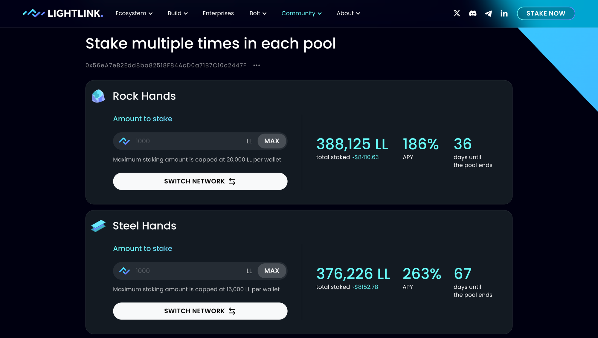 - Stake your LL tokens in any of the three available pools.