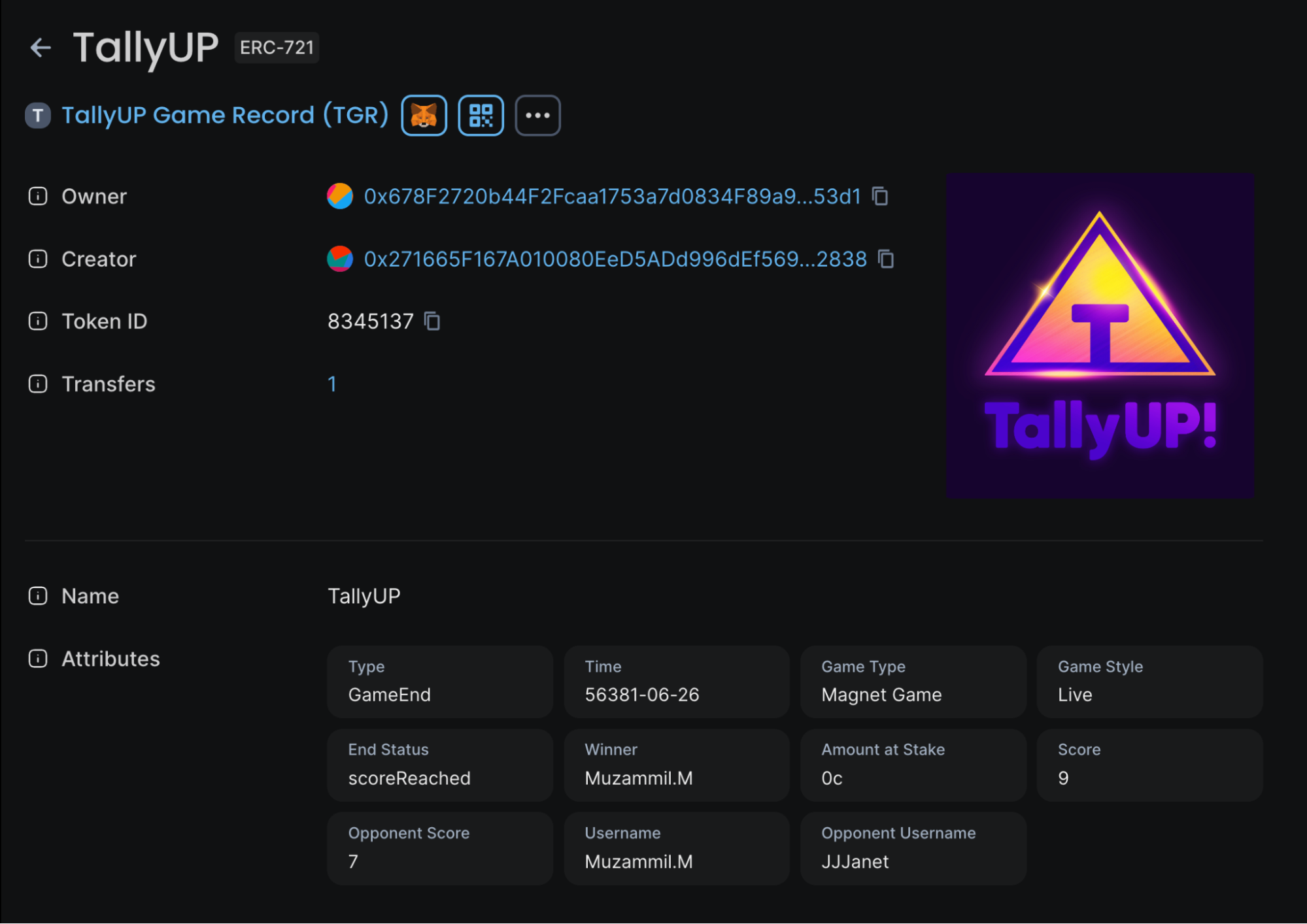TallyUP! mints between 50,000 to 100,000 tokens daily and has recently surpassed 8 million tokens minted. Each token records game details such as type, duration, end status, players’ nicknames, and scores.